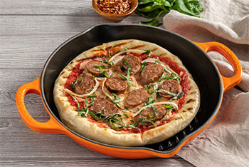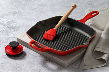 Which grill pan you choose depends on which size and shape of pizza you want to make. But the one non-negotiable is that it is made of cast iron. Only heavy-duty cast iron grill pans have the even heat distribution and high heat capacity necessary for a crisp, chewy crust. Le Creuset Grill Pans are crafted from cast iron but then finished with a black satin enamel interior which allows for higher surface temperature cooking, ensuring perfectly grilled toppings as well as expertly cooked dough. It also is easier to clean and maintain than raw cast iron.