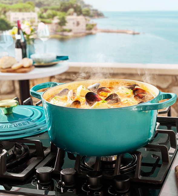 Heat olive oil in a Le Creuset Signature 30cm Round Casserole set over medium heat. When the oil is hot, add the onion, fennel, and leek. Sauté until the onion and leek begin to brown, about 5 minutes. Add the fennel seeds, saffron threads, garlic, tomatoes, tomato paste, and orange zest. Stir to combine, and cook until fragrant, about 1-2 minutes.