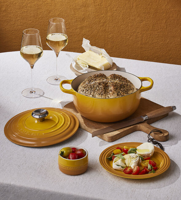 Lightly grease your Le Creuset 24cm Cast Iron Sauteuse with oil and place the dough inside. Brush the surface of the dough with oil and cover with the remaining seeds. Using a sharp knife, score a cross on top.