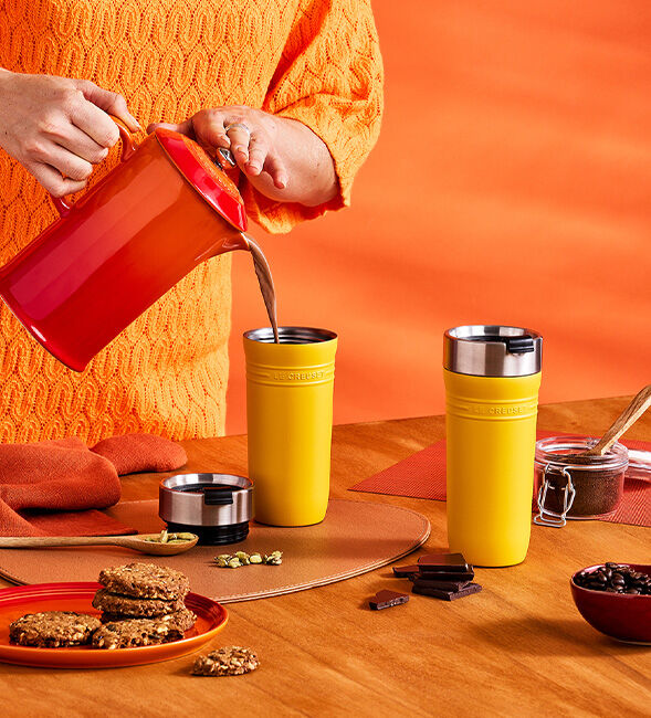 Stir until fully melted, then strain out the cardamom pods. Once your coffee is ready, mix in the chocolate cardamom milk. Pour into your Le Creuset On The Go Travel Mug and seize the day!
