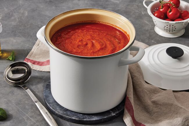Bring to a simmer over medium-high heat. Reduce the heat to low and cover the pot. Simmer, stirring occasionally, until the sauce thickens, about 15 minutes. Season to taste with more salt if needed. Sauce can be used immediately, stored in the refrigerator for up to three days, or frozen for up to one month.