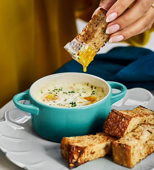 Season with salt and pepper and top with minced chives. Serve with warm buttered toast for dipping.