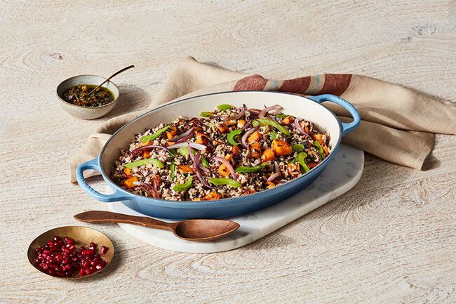Heat olive oil in an enameled cast iron baker over medium heat. When the oil is hot, add onion, celery, sweet potato, salt and pepper. Sauté until vegetables are tender, about 12-15 minutes. Add wild rice and stir to combine. Season to taste with additional salt and pepper if desired.