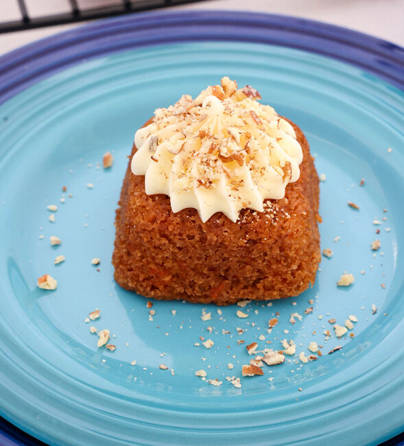 For the frosting, beat the cream cheese and butter for 2 minutes. Sift the icing sugar, in 2 additions, mixing well after each addition. Frost the mini cakes as desired and add a sprinkling of pecans.