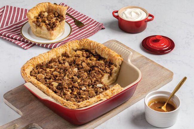 Pairing ginger with pears is all about creating alluring contrasts – the subtle honeyed sweetness of the fruit and the zesty, tingly heat of the ginger creates sparks on the palate. In this lovely pie, you’ll find them perfectly mingled together, with an almond, oat and gingersnap topping giving way to a luscious lemon and vanilla-scented pear filling. The shape of the Heritage Square Baking Dish means there are lots of golden, crumbly edges, which is everyone’s favourite part.