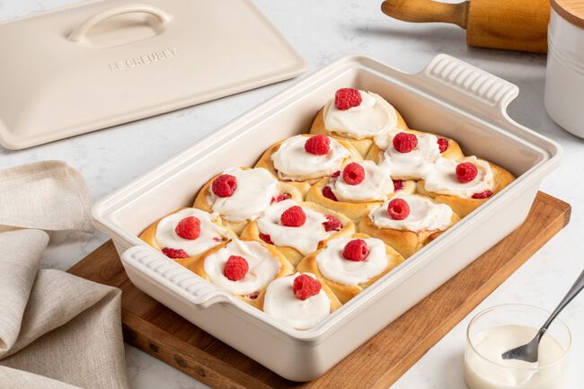 A pot of hot coffee and a plate of these golden brioche rolls are all you need for a perfectly cozy morning. They’re made from a classic brioche dough recipe that is easy to master and infinitely customizable for both sweet and savory fillings and flavorings. In this version, the rolls are filled with a sweet cream cheese and fresh raspberry filling and drizzled with a vanilla glaze for a cleverly refined twist on classic cinnamon rolls.