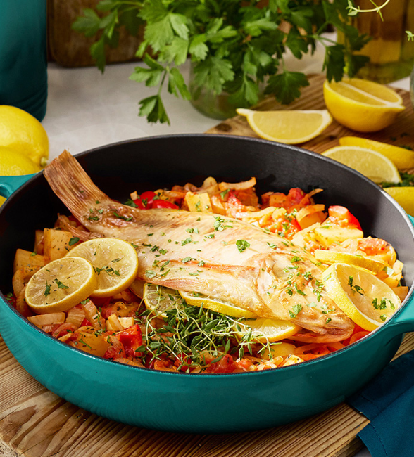 Place the pan back in the oven, and roast until the fish is cooked through, opaque, and easily flakes with a fork, about 20-25 minutes depending on the size of the fish. Remove the pan from the oven and carefully move the fish to a cutting board. Remove bones and skin and cut into individual portions. Serve the fish along with the roasted vegetables and garnish with the lemon wedges and fresh parsley.