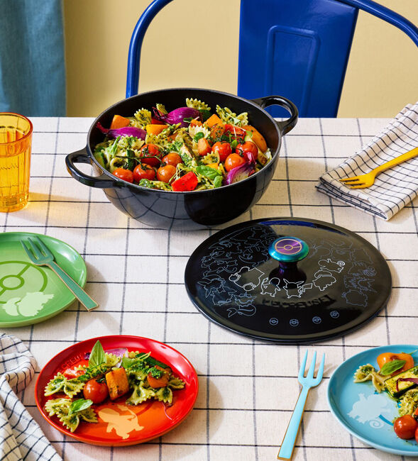 While the vegetables are cooking, fill the Le Creuset Pokémon 22cm Classic Soup Pot with boiling water and add a pinch of salt. Bring to the boil on the stove, and once boiling, add your pasta and cook until al dente. Drain and rinse under cold water. Drizzle with olive oil.