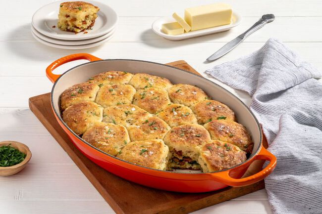 Bacon-laced buttermilk biscuits rise tall and fluffy when tucked close together and baked in our enameled cast iron Signature Oval Baker. With caramelized shallots, minced bacon and nutty gruyere layered into a buttery dough, these decadent biscuits are equally at home on the holiday appetizer buffet as they are at the breakfast table. Use a 2-inch biscuit cutter to punch out small biscuits that are the perfect size to enjoy out of hand.