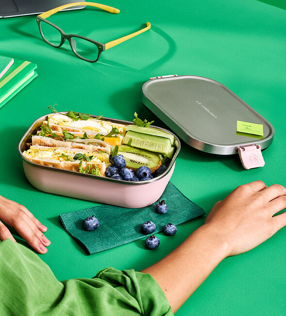 Assemble the sandwich with the egg mayo. Halve your extra egg and place it in the middle of each sandwich, add frilly lettuce and cut in half. Serve in your Le Creuset On The Go Lunch Box with blueberries, cucumber sticks and kiwi fruit.